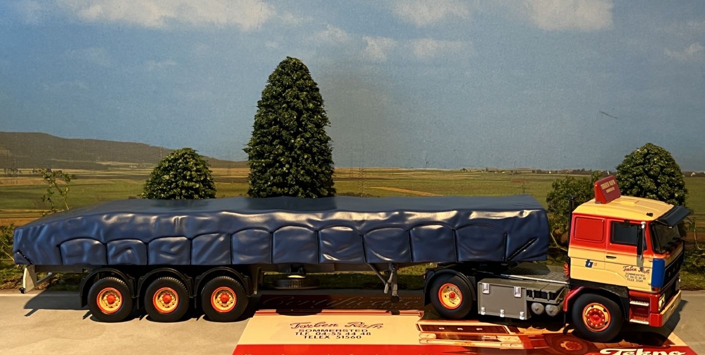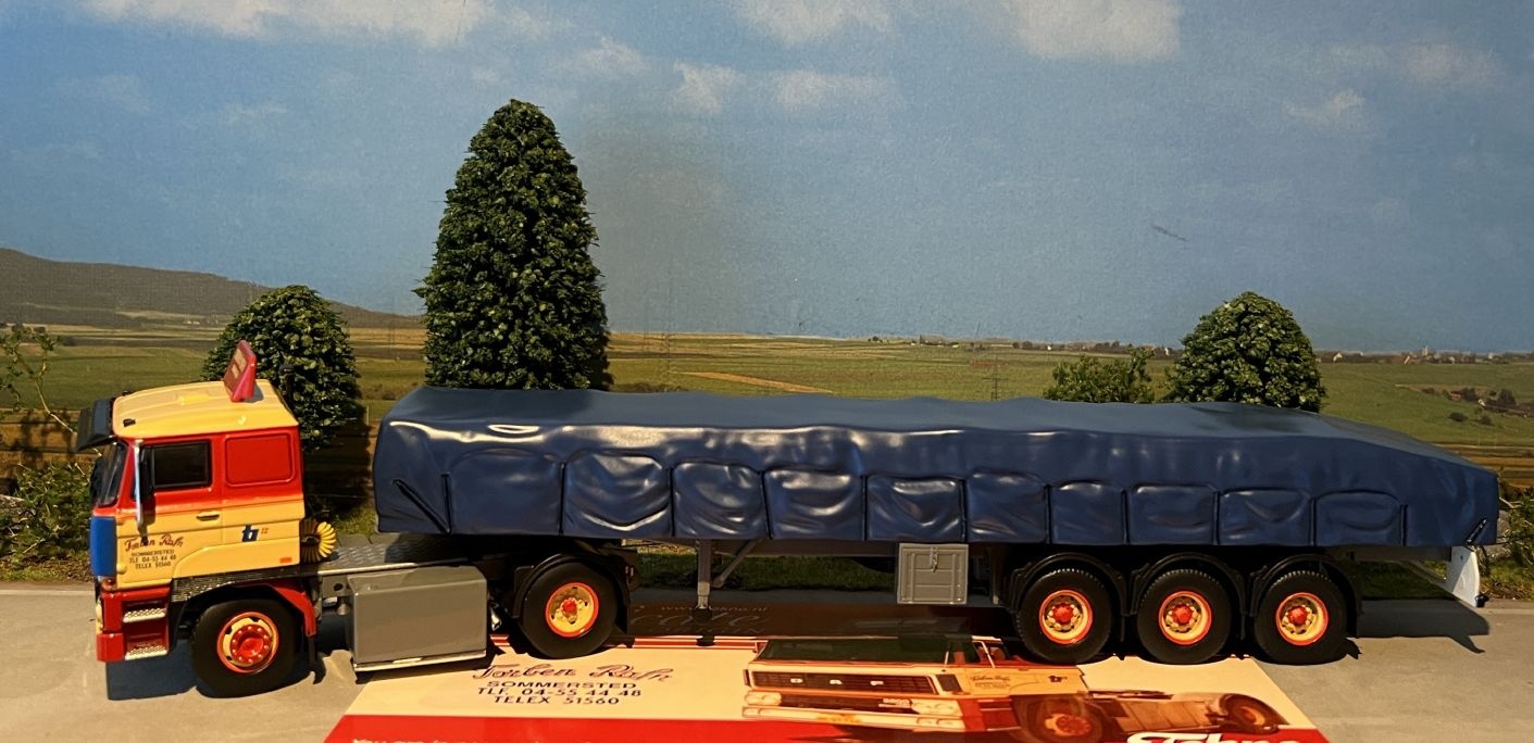 Review Tekno DAF 2800 with 3-axle classic flatbed trailer + covered load Torben Rafn