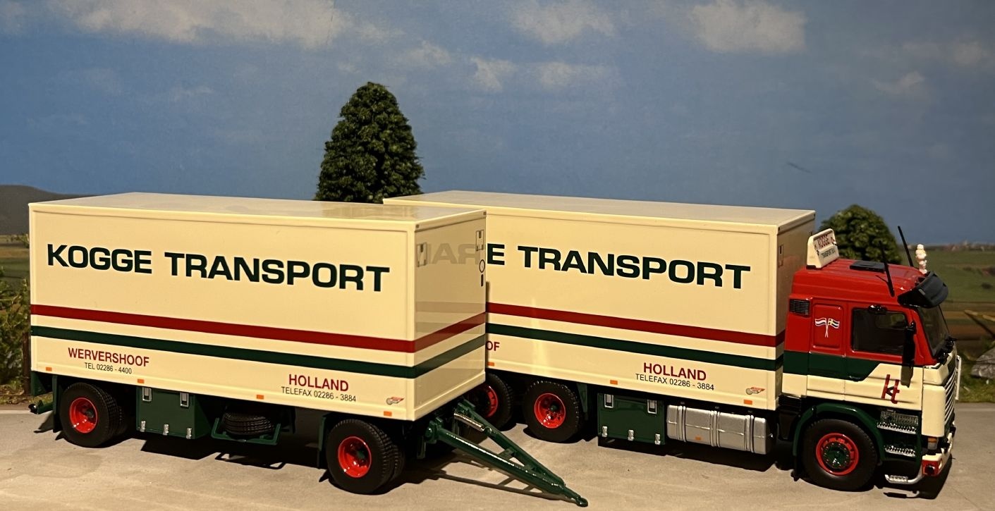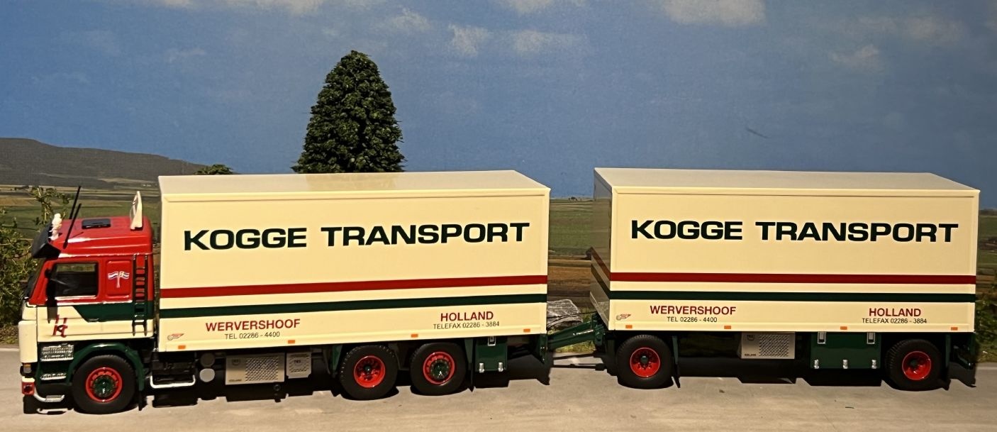 Review Tekno Scania 143M rigid truck with 2-axle trailer KOGGE TRANSPORT