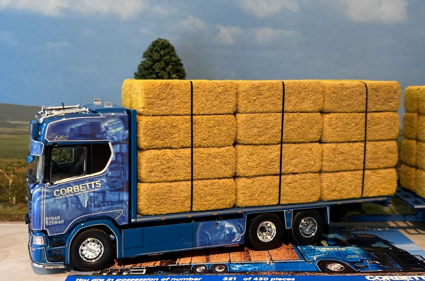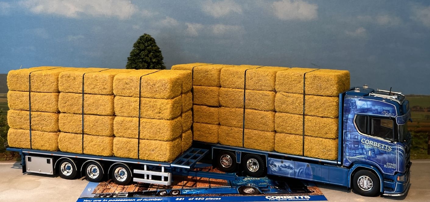 Tekno Scania Next Gen S650 Highline rigid truck with 3-axle flatbed trailer (incl. load) CORBETTS