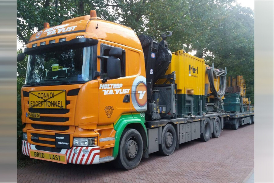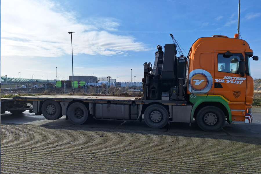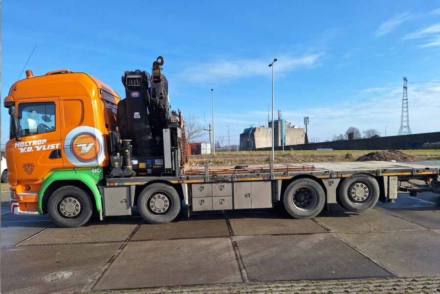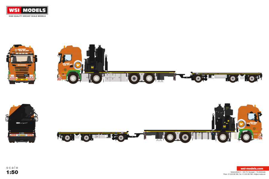 WSI Scania streamline highline riged flatbed truck 8x2 with 3-axle flatbed trailer + palfinger HOLTROP VD VLIST