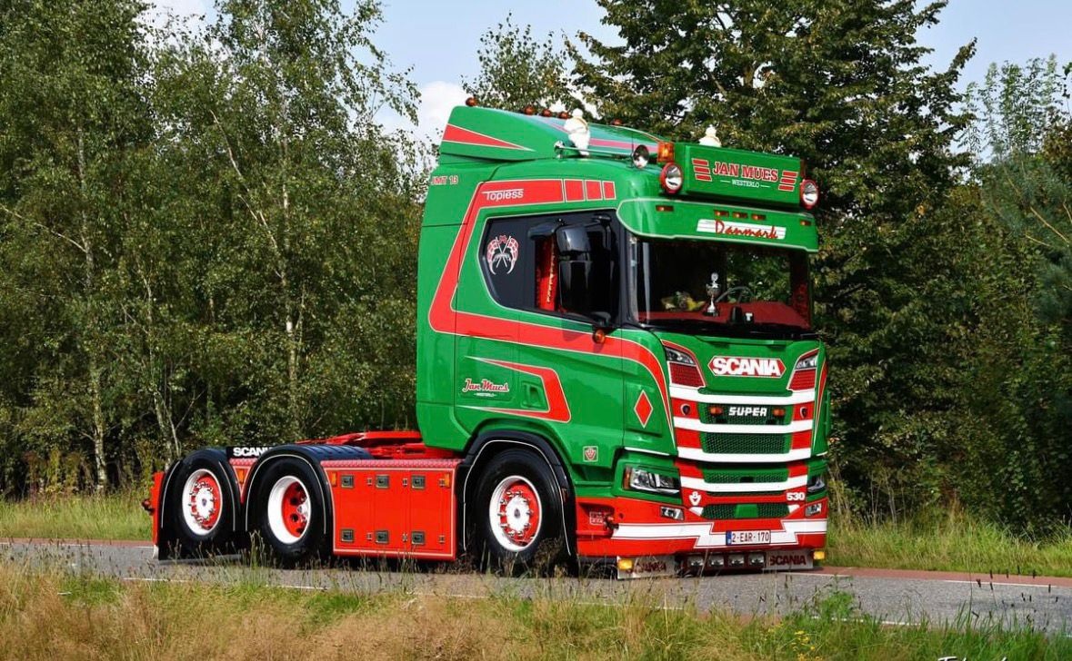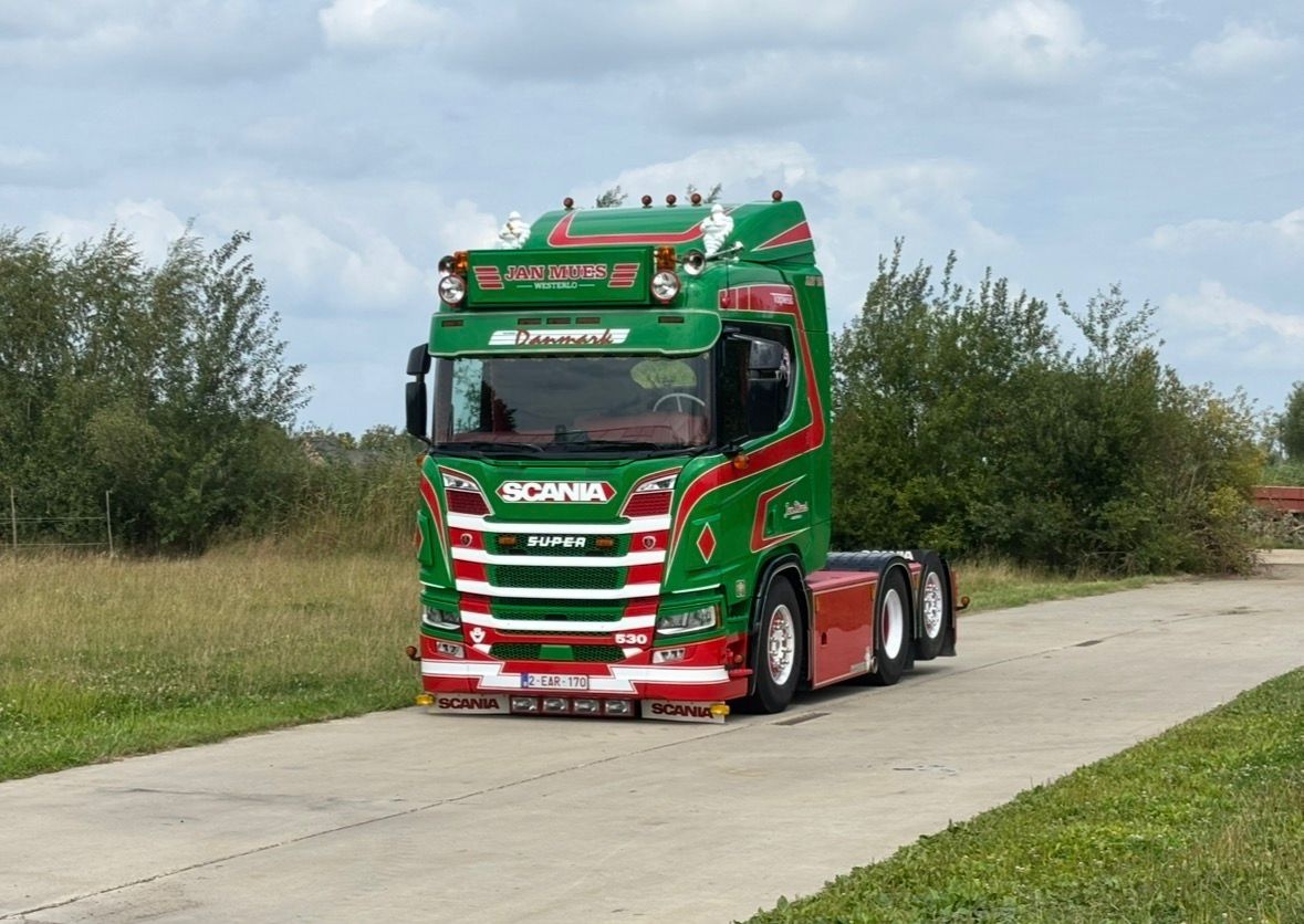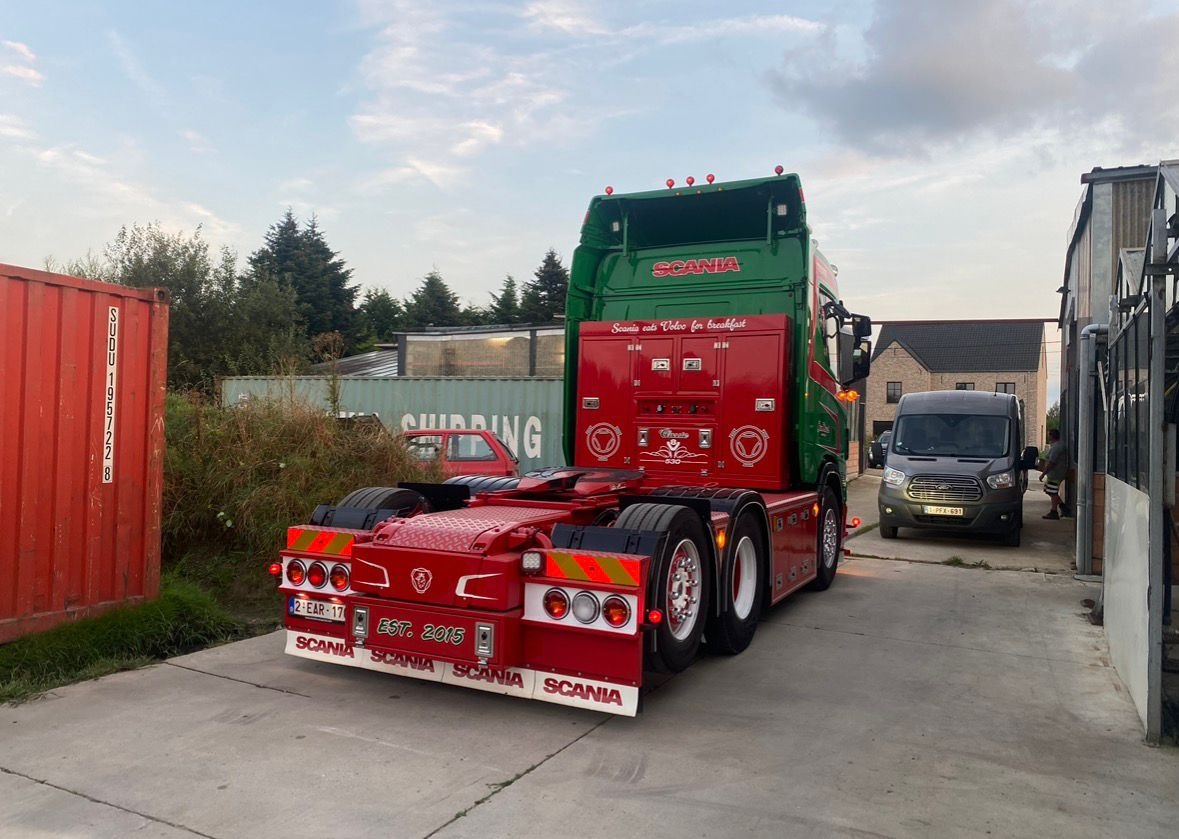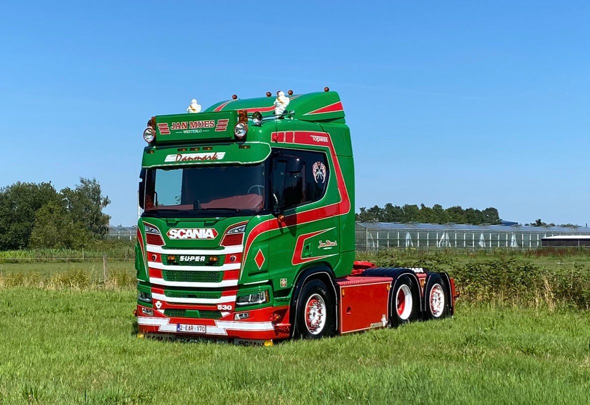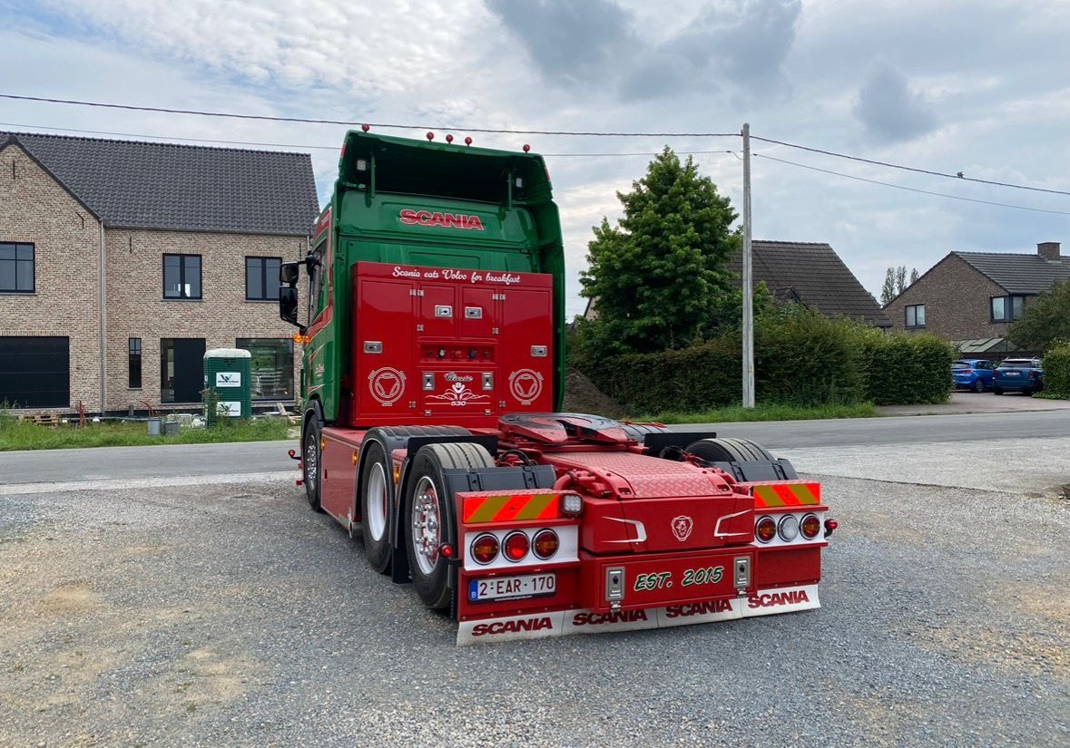 Tekno Scania NGR 6x2 met 2-assige dieplader en houten kist JAN MUES