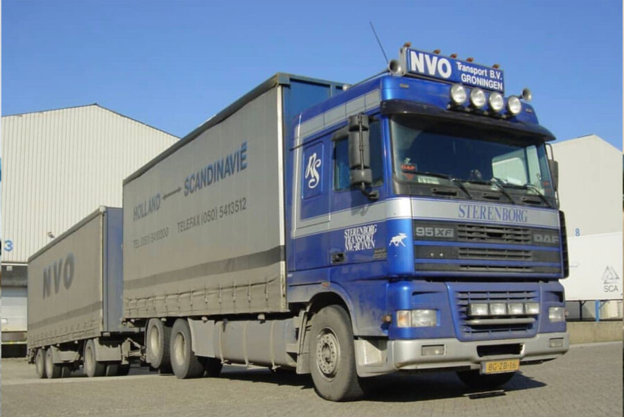 Beoordeel WSI DAF 95XF space cab 6x2 motorwagen met 3-assige schuifzeilen trailer STERENBORG