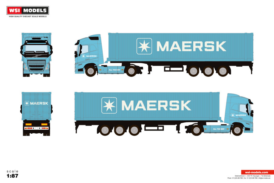 WSI Volvo FH12 Globetrotter XHSL 4x2 + 3-axle container trailer + 45ft. container MAERSK SCALE 1:87