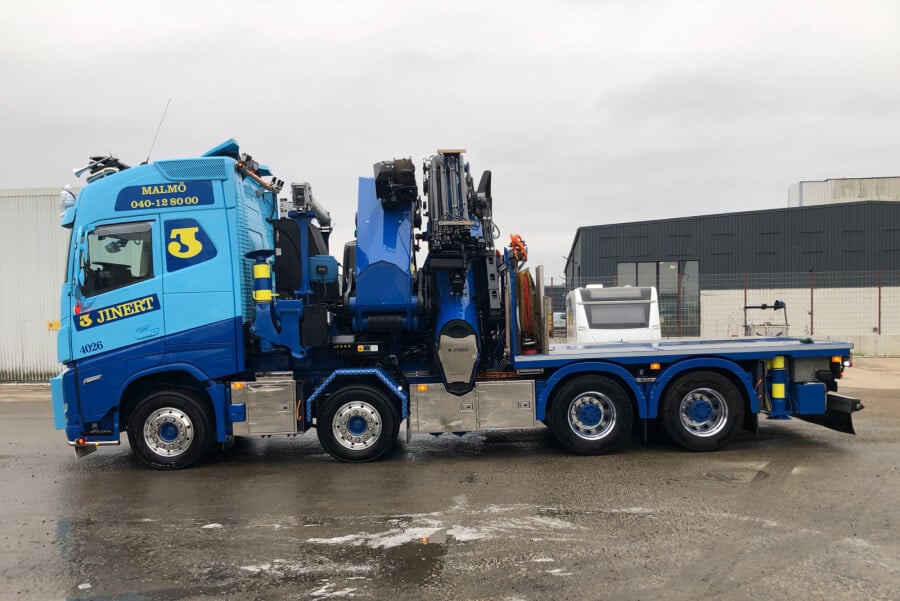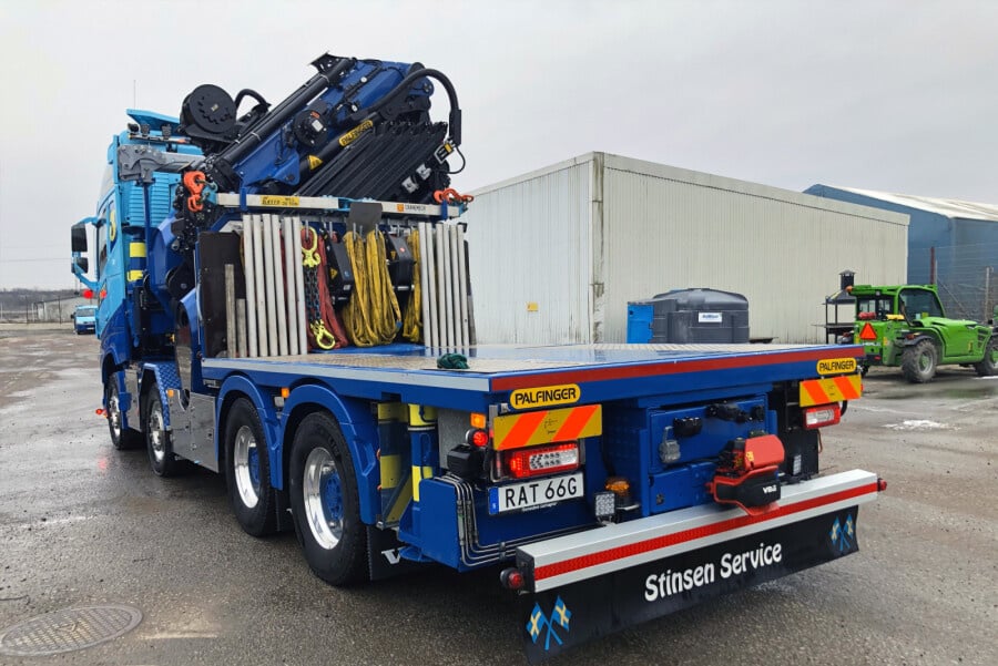 Volvo FH5 Globetrotter Riged flatbed truck 8x4 with palfinger PK 165.002 tec 7 + jib